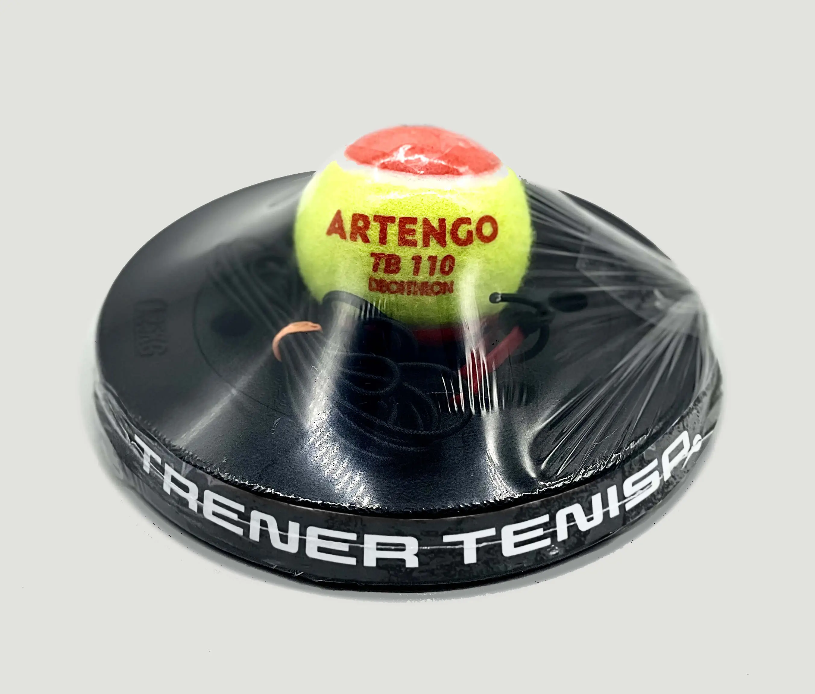 Kompletny zestaw Trenera tenisa: piłka tenisowa z gumą, system mocowania, podstawa, rakieta tenisowa.